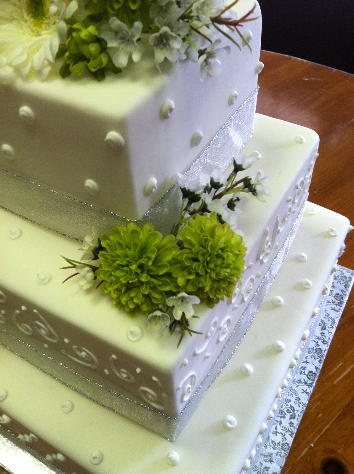 This was a elegant and simple spring wedding cake! I am in love with this color scheme!!! This was a small three tier cake covered in white fondant. It had a silver ribbon around the bottom of each tier and had white icing decorations on each side. We used a variety of the flowers used in wedding.
